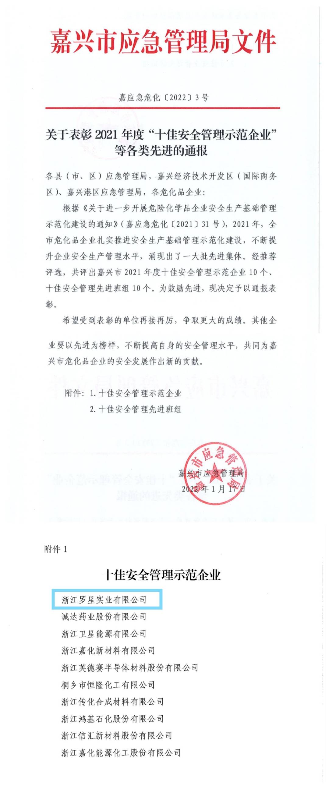 羅星化學(xué)榮獲2021年度“嘉興市十佳安全管理示范企業(yè)”